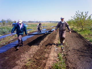 今までの畑にとうもろこしやトマトなどを植えるため、マルチ張りを行いました。